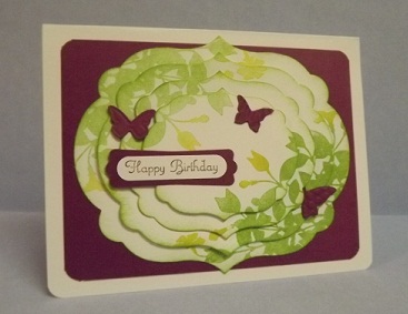 She's used My Friend and Create a Cupcake stamp sets. Cardstock and ink includes Rich Razzleberry, gumball green, and Summer Starfruit. Punches used are Modern Label and Word Window. She used Label Collection Framelits to cut the layers and butterflies are cut with Beautiful Wings.